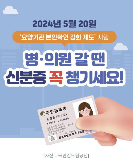 "국민건강보험법 제 12조 4항 개정에 따라서 2024년 5월 20일 부터 모든 요양기관에서 가입자 또는 피부양자에게 요양급여를 실시하는 경우, 건강보험증이나 신분증명서로 본인 확인을 실시해야 합니다.