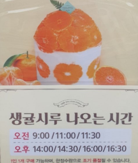 먼저 성심당 DCC 점은 하루에 7번만 구매를 할 수 있습니다. 저는 주말 오전 일찍 가면 오래 기다리지 않고 구매할 수 있었습니다. 이건 사실 정말 몰리는 날에는 못 사는 경우도 있습니다. 잘 선택하셔야 합니다. 생귤시루가 나오는 시간은 오전 9시, 11시, 11시 30분입니다. 오후에는 14시, 14시 30분, 16시, 16시 30분입니다. 한 타임에 대략 20개 정도만 판매를 합니다. 이 점 확인하시고 줄이 너무 길고 모두 생귤시루를 기다리는 줄이라고 하면 다른 지점으로 가시는 것을 추천드립니다.