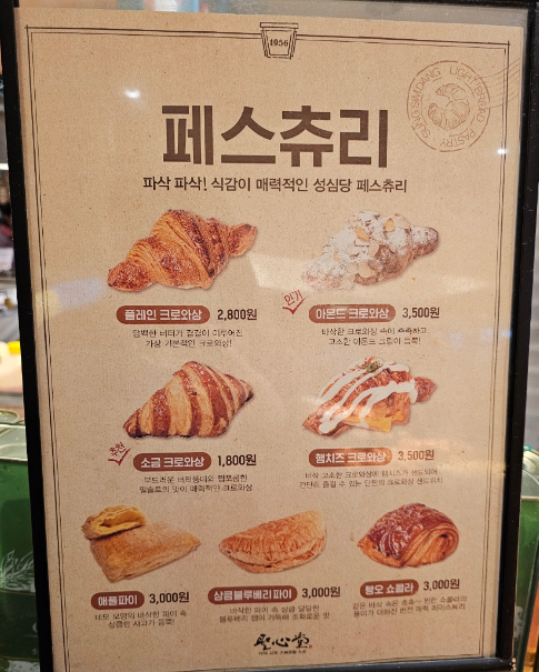 아몬드 크로와상을 자주 먹고 있습니다. 그 이유는 바삭바삭하고 크로와상의 식감을 개인적으로 매우 좋아합니다. 거기에 속에는 달달하고 고소한 아몬드 크림이 들어가 있습니다. 겉에 바삭하면서 입에서 먹으면 달달한 크림이 정말 맛있습니다. 많이 달지 않고 아이스 라떼랑 같이 먹으면 정말 너무 좋습니다. 아몬드 슬라이스와 크림이 더해져 크로와상보다 조금 더 가격이 있지만 크로와상이 조금 심심하다고 느끼시는 분들에게는 정말 강력 추천드립니다. 3,500원이 전혀 아깝지 않습니다. 성심당 본점, 롯데백화점 대전점, DCC 점에서는 이 빵을 구할 수 있습니다.