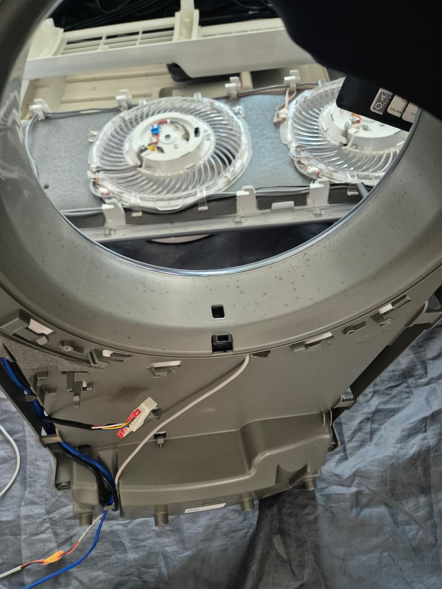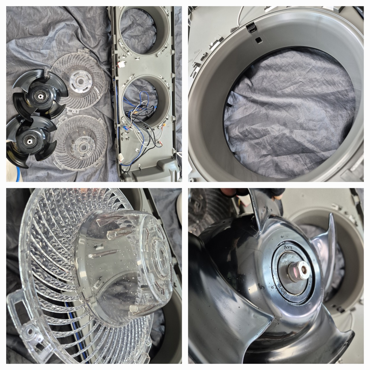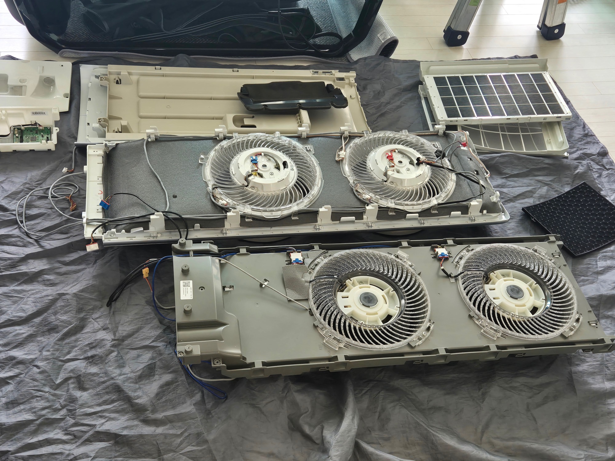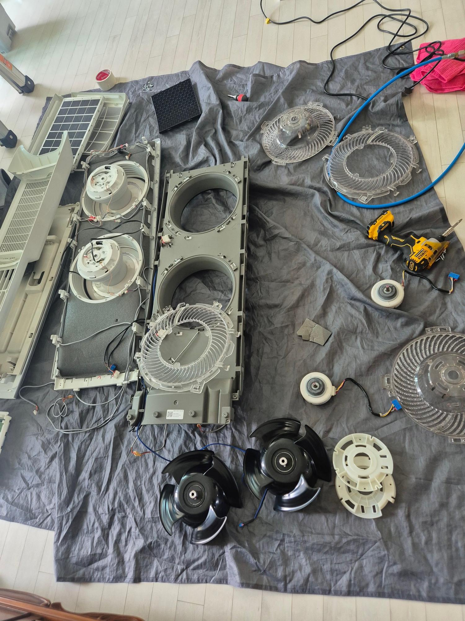 부품별로 다 분리하는 걸 보니 혼자서는 절대 청소할 수가 없겠다고 느꼈어요. 만약 셀프로 하다가 연결 전원 선이 잘못되면 청소하려다가 에어컨이 동작을 안 할 수가 있겠더라고요.