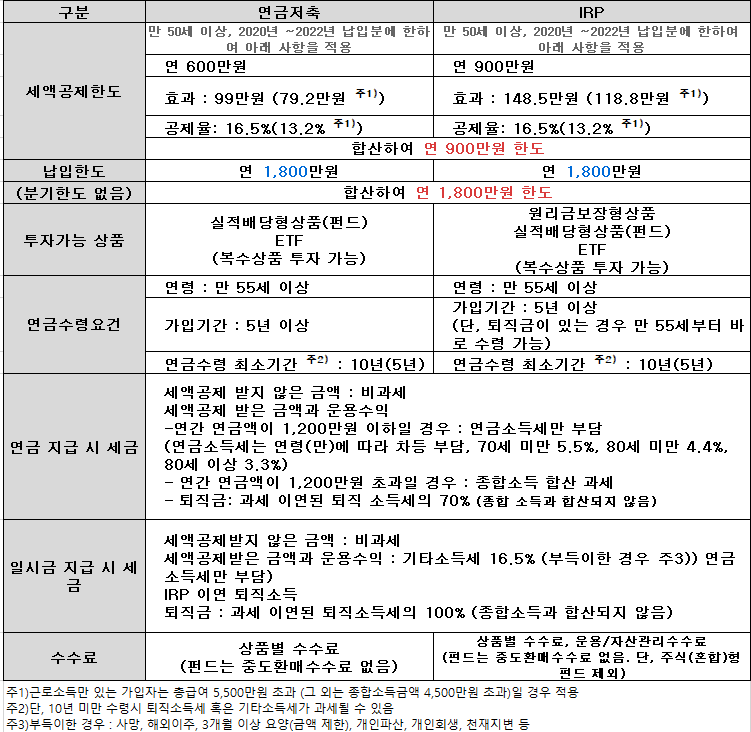 연금저축과 IRP를 비교한 자료입니다. 세액공제 한도는 연금저축/IRP가 각 연 600만 원/900만 원입니다. 공제율은 소득에 따라 차이가 있습니다. 두 가지 모두 만 55세 이후 연금 수령이 가능합니다.