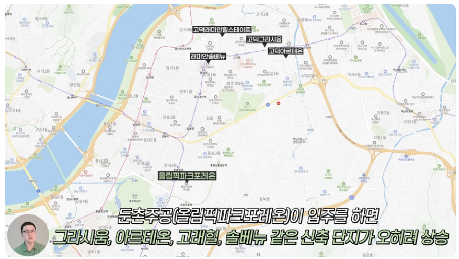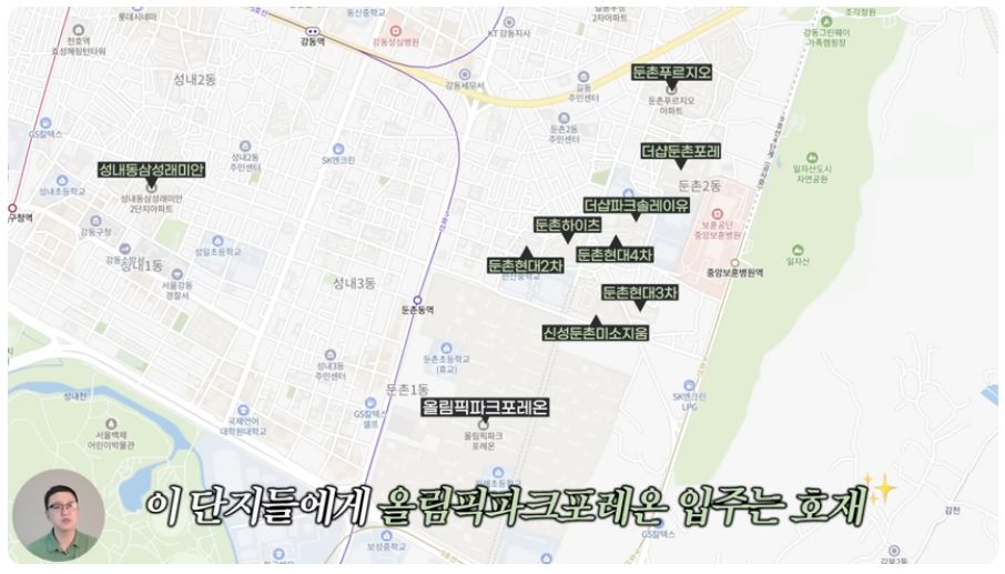 올림픽 파크 포레온 주변에 단지들이 몇 개가 있죠, 신성 둔촌, 미소지움, 더샵 파크 솔레이유, 둔촌 하이츠, 둔촌 현대 2차, 3차, 4차, 더샵 둔촌 포레, 둔촌 푸르지오, 길 건너에 성내동, 삼성 미한 이런 단지들이 있는데요. 이 단지들에 올림픽 파크 포레온이 입주를 하는 것은 호재입니다. 그러나 우리는 올림픽 파크 포레온 수요와 겹치는지 한번 볼 필요가 있겠습니다.