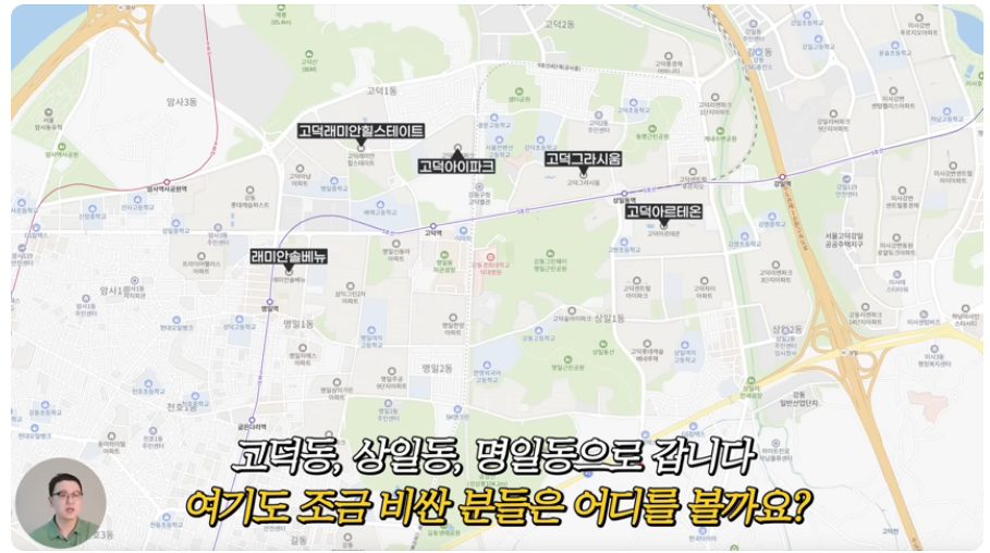 고덕 그라시움, 아르테온, 고덕 레미안 힐스테이트, 고덕 아이파크, 솔베뉴 이런 고덕동, 상일동, 명일동 갑니다. 여기도 좀 비싸고 하는 분들은 어디를 볼까요? 그 다음으로는 고덕 자이, 고덕 센트럴 아이파크 여기를 보다가 가락동 구축 아파트를 볼 겁니다. 그리고 나서 올림픽 파크 포레온 주변에 있는 구축 단지들을 볼 거예요.