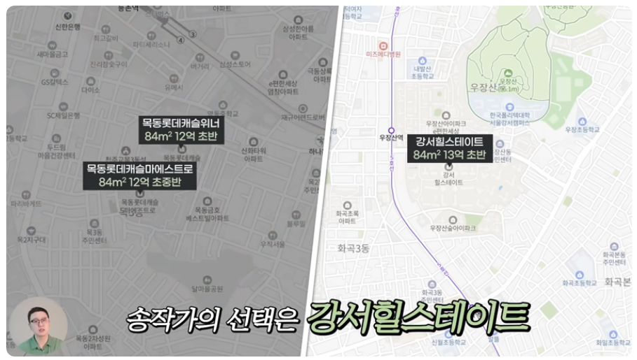 셋 중에 가장 비싸죠. 저에게 뭐 살래라고 한다면, 저는 강서 힐스테이트 하겠습니다. 강서 힐스테이트 근처에 있는 우장산 아이파크, 이편한세상 우장산, 힐스테이트 이 세 개 단지는 시세가 같이 움직이고, 이 세 개 아파트는 모두 환금성이 좋아요. 이 세 개 같이 보면 좋을 것 같은데, 그런데 사연자 분께 조심스럽게 제안을 드리자면, 일단 고정관념부터 깨야 됩니다.