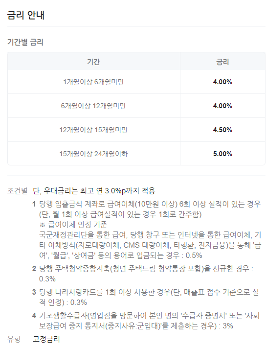 - 기초생활수급자 대상 추가 우대금리 : IBK(3%/24.1월~), 국민은행(2.5%/24.6.3.~)