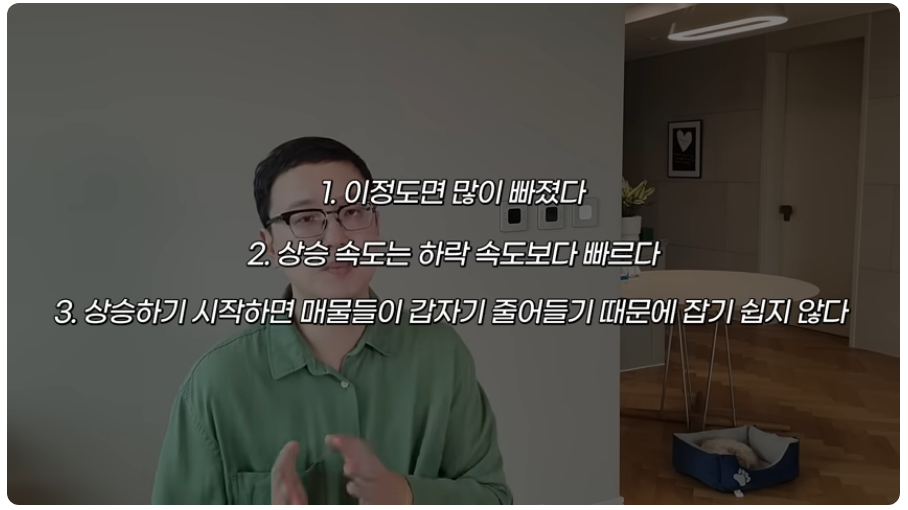 그러면 앞으로의 저점은 언제 올까요? 이건 몰라요. 예측하기가 어렵습니다. 작년에 제 영상들을 보시면, 30%, 40% 빠진 곳들이 많으니까 샀으면 좋겠다고 말씀을 많이 드렸는데, 그때 또 제가 같이 했던 말이 뭐냐면, 첫 번째, 이 정도면 많이 빠졌고, 두 번째, 상승의 속도는 하락의 속도보다 빠르고, 세 번째 상승하기 시작하면, 매물들이 갑자기 줄어들기 때문에 잡기가 쉽지 않다고 말씀을 드렸었습니다. 그래서 경험해 보신 분들은 알 거예요. 사겠다고 결정했더라면, 또 다른 매물을 사겠다고 갔더니 5천만 원 올려 달래, 그러면 벌써 감정이 탁 상해 버리죠.