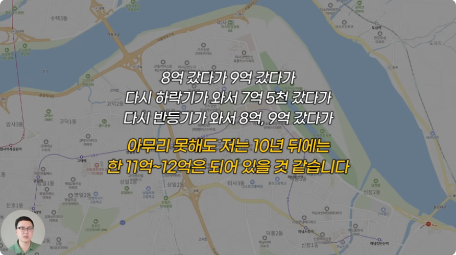과연 현재의 시세가 비싸다고 느껴질까요? 예를 들어서 최근에 하남 미사신도시에 있는 아파트를 8억에 매수했다면, 10년 뒤에는 얼마가 되어 있을까요? 이게 8억에 갔다가, 9억 갔다가, 다시 하락기 와서 7억 5천 갔다가, 다시 반등기 와서 8억, 9억 갔다가, 아무리 못해도 저는 10년 뒤에는 한 11억, 12억은 되어 있을 것 같습니다. 동작구에 있는 상도 더샵은 11억 5천에 최근에 매수했다면, 10년 뒤에는 아무리 못해도 14억, 15억이 되어 있지 않을까요? 그래서 내가 매수했다면 고점 잡았나 이런 고민을 할 필요가 없습니다. 제가 여태까지 수십 번의 거래를 하면서 고점이 아니었던 적은 두 번, 세 번밖에 없어요.