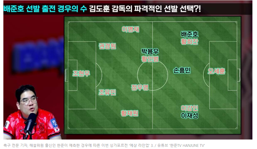 해설위원이 싱가포르전 예상 라인업으로 뽑은 안중에 하나다. 지난 경기 배준호 선수의 경기력이 좋아 보여 이번 중국전에는 충분히 선발로 출전할만 하다. 중국전에 아래 라인업을 기대해 본다.