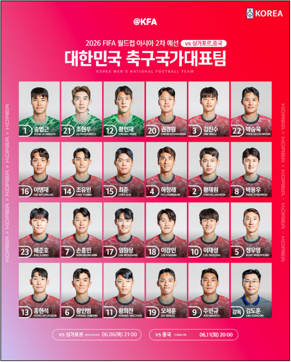 북중미 월드컵 2차 예선 일정 6월 11일 오후 8시 서울월드컵 경기장 대한민국 vs 중국 국가대표 명단임시감독 : 김도훈GK : 조현우, 송범근, 확인재DF : 권경원, 박승욱, 조유민, 하창래, 김진수, 이명