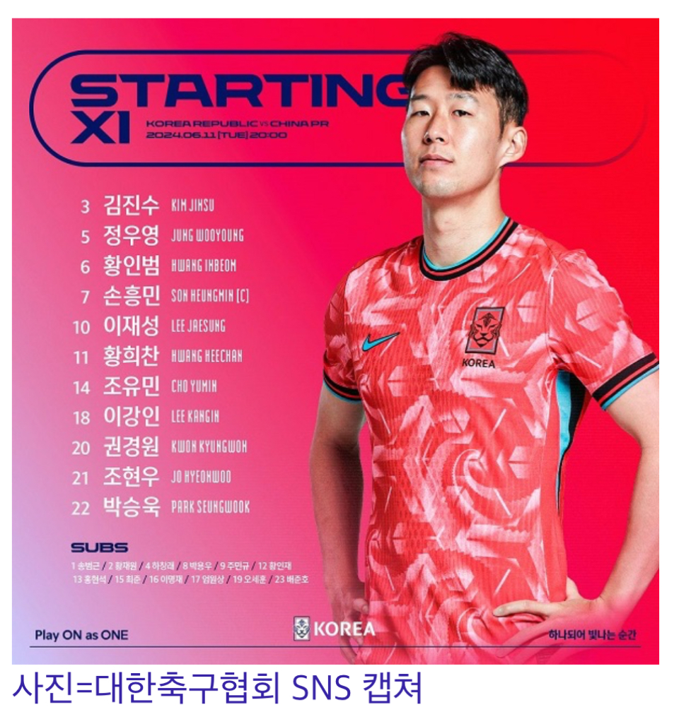중국전 선발 라인업 공개(2024.6.11. 17:50확정 )