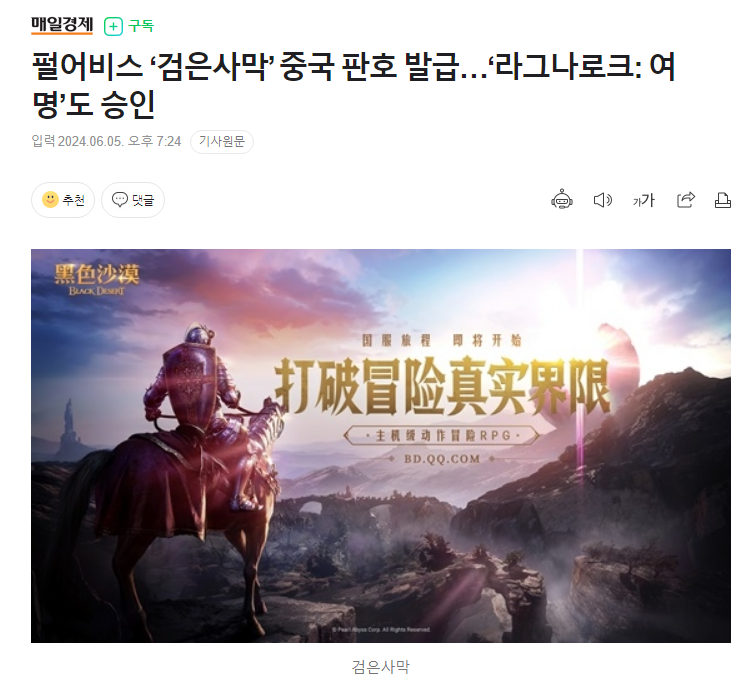 펄어비스의 MMORPG '검은사막'이 중국 내 게임 서비스를 허가받았다. 검은사막은 2014년 국내 오픈 베타를 거쳐 2015년 한국 시장에서 정식 출시된 이래 전 세계에서 12개 언어로 5천만 명 이상이 즐긴 게임이다. 펄 어비스는 텐센트와 퍼블리싱 계약을 체결하였다. 검은사막은 북미 게임 미디어에서 게이머가 뽑은 최고의 MMO 중 국내 MMORPG 유일하게 최다 판매 부문을 차지했다.