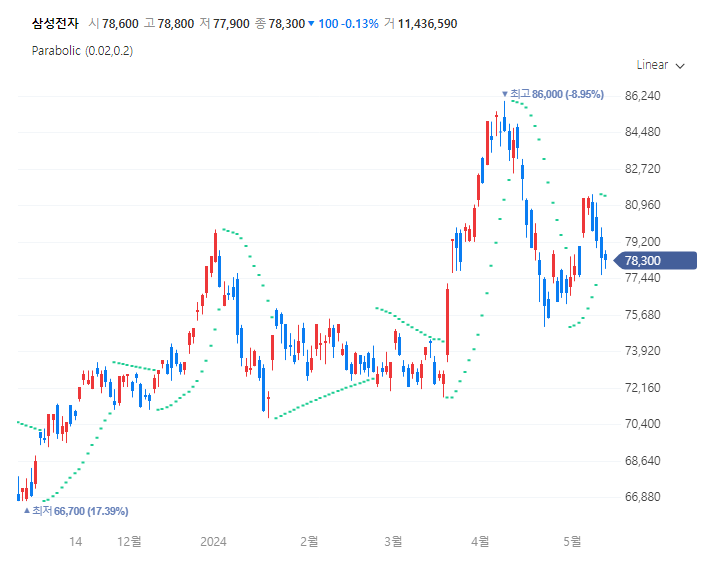Parabolic SAR는 Parabolic Stop And Reverse의 약자로 추세를 파악하는 지표로 주식차트에서 현재의 트렌드 방향을 나타내는 지표입니다. 추세의 방향이 역전될 때 신호를 생성합니다. 이 지표는 점이나 선의 형태로 차트에 나타나며, 주가의 상승 또는 하락 트렌드를 따라 움직입니다.
