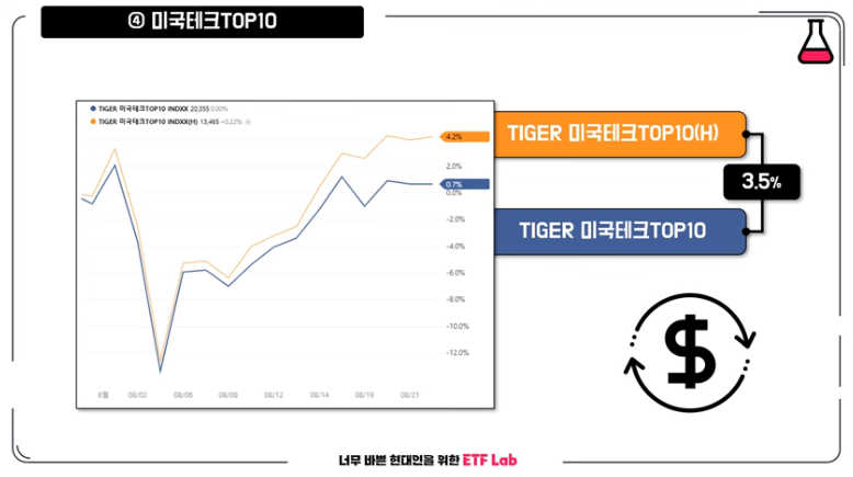 헷지 상품을 보면 시원하게 반등한 것을 볼 수 있는데요. 재밌는 사실은 앞에서 미국 배당 다우존스는 환노출 상품은 반등을 못 했는데, 미국 테크탑 10은 반등을 보여줬습니다. 둘의 빅테크 기업들은 환율과 상관없이 움직인 걸까요? 그건 아니겠죠. 둘의 갭을 보면 앞에서 봤던 종목들과 비슷하게 3.5% 갭이 있습니다.. 그 말은 빅테크 기업이 강한 상승을 보여줬기 때문에 반등이 멋지게 나왔지만, 여전히 환율의 갭은 메꾸지 못한 모습입니다.