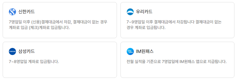 카드사에서 사용자의 지급금액을 확인한 뒤 카드사의 정책에 따라 지급합니다. 실제 지급되는 일자와 금액이 다를 수 있습니다. 이용 중인 카드사의 지급 정책을 잘 확인해 주시기 바랍니다.