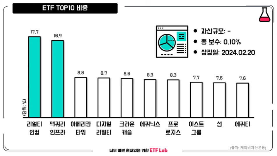 ETF 특징부터 짚어보면 크게 세 가지가 있습니다. 첫 번째는 리얼티인컴과 맥쿼리인프라 같은 인기 종목을 담고 있는 거죠. 두 번째는 연금 저축과 ISA 계좌로 투자가 가능합니다. 마지막 세 번째는 요즘 대세죠, 메달 배당을 지급하는 월배당 형태입니다. 투자 기업을 보면 리얼티인컴, 맥쿼리인프라, 아메리칸 타워, 디지털 리얼티, 크라운 캐슬, 에퀴닉스, 프로로지스 등 대표 리츠 기업들이 모두 포진되어 있습니다. 리얼티인컴과 맥쿼리인프라의 비중이 가장 큽니다.