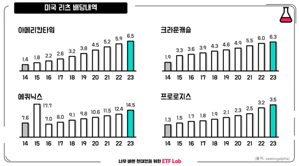 KBSTAR 글로벌 리얼티인컴은 배당 성장률 차이가 어떤 결과를 만들어 내는지 살펴볼게요. 2014년에 둘 다 동일하게 100만 원의 배당금을 지급받았다고 가정해 보겠습니다. 추가 투자금 없이 그대로 놔뒀다면, 현재 얼마의 배당금을 받고 있을까요? 현재 기준으로 리얼티인컴은 144만 원이고 맥쿼리인프라는 185만 원을 받게 됩니다. 둘 다 배당금이 증가했는데요. 맥쿼리인프라가 41만 원 더 많습니다. 그만큼 배당금 인상률이 높았다는 이야기죠. 하지만 오랫동안 배당금 삭감 없이 인상해 준 기업은 리얼티인컴입니다. 배당 신뢰 측면에서는 리얼티인컴이 더 매력적입니다. 나머지 여덟 개 미국 리치 기업 중에 대표 기업의 배당 내역을 살펴볼게요. 통신 인프라 기업인 아메리칸 타워와 크라운 캐슬 데이터센터, 리츠 기업인 에퀴닉스, 물류 리츠 기업인 프로로지스의 배당 내역입니다. 최근 10년 동안의 배당 이력은 모두 멋진 우상향을 그리고 있습니다. 에퀴닉스는 특별 배당으로 2015년에 잠깐 튀었지만, 양호하지. 최근 리츠 기업이 맥을 못 추고 있지만, 길게 보면 역시 건강한 상승을 보여주고 있는 미국 리츠 기업들이죠.