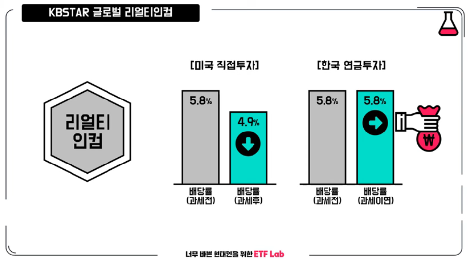 배당률로 한번 생각해 볼게요. 미국에 직접 투자를 하면, 현재 리얼티인컴엔 4.9% 됩니다. 그런데 연금 저축으로 투자하면 배당률 5.8% 그대로 받을 수 있습니다. 과세 이연 효과인데요. 나중에 10년, 20년 뒤 연금을 수령할 때 5.5% 연금 소득세를 내야 하지만, 그전에는 세금까지 자산으로 굴릴 수 있다는 큰 장점이 있죠. 그만큼 복리 효과 또한 크게 적용됩니다. KBSTAR 글로벌 리얼티인컴은 한국과 미국 양국의 대표주들이 함께 모여 있는 구성으로 투자의 안정성을 보장합니다.