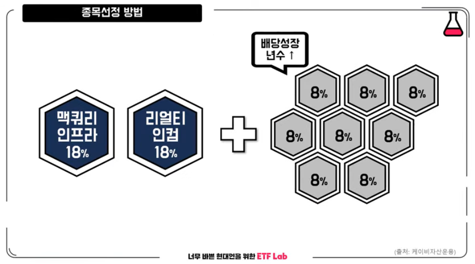 맥쿼리인프라와 리얼티인컴에 따라 비중이 바뀌게 되는 점 참고해 주세요. 오른쪽 여덟 개 기업을 선정하는 방법은, 은 배당 성장 연수가 높은 순서대로 선별됩니다. 그중에 시가총액이 높은 순으로 나열되는 방식이죠. 그래서 아메리칸 타워, 크라운 캐슬, 에퀴닉스 같은 미국 우량 리츠 기업이 포진된 겁니다. 리밸런싱을 1년에 두 번 진행됩니다. 즉 6개월에 한 번씩, 원래 비중으로 다시 조정하는 시간을 갖는데요. 리얼티인컴과 맥쿼리인프라는 원래 비중 18%로 조정되고, 배당 연수와 k시총을 보고 나머지 여덟 개 기업 또한 재조정하는 방식입니다.