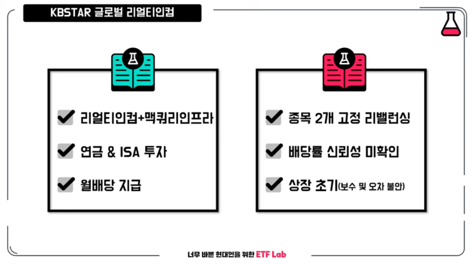 KBSTAR 글로벌 리얼티인컴의 장점과 단점을 정리해 볼게요. 우선 장점은 리얼티인컴과 맥쿼리인프라를 한 번에 투자할 수 있다는 것이고 연금 저축과 ISA 계좌로 활용할 수 있습니다. 인기 있는 월 배당 구조를 갖고 있고요. 단점은 두 개 종목이 고정되어 리밸런싱 하더라도 비중이 높습니다. 그만큼 리얼티인컴과 맥컬 인프라에 대한 깊은 이해가 필요합니다. 급하게 투자하기보다는 해당 기업의 배당률만큼 배당 지급이 되는지 확인하고 투자해도 늦지 않을 것 같네요.