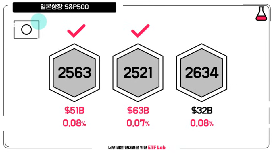 잠깐, 혹시 엔화가 저렴해서 일본에 상장된 종목을 고민하고 계신 분들도 있을 수 있는데요. 일본에 상장된 미국 S&P 500은. 2563, 2521, 2634 세 가지가 있습니다. 이 중에 거래량이 가장 높은 것은 2563이고. 총보수가 가정 저렴한 것은 2521입니다. 일본의 종목은 코드 번호로 되어 있으며 엔화로 투자하는 분들 참고해 주세요.