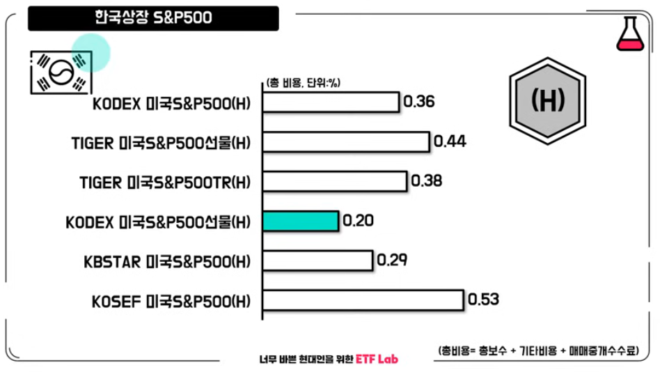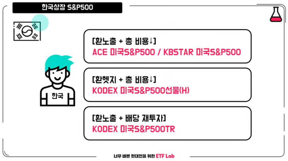이제 한국에서 투자할 수 있는 SMP 500을 살펴볼게요. 한국은 크게 세 가지로 나눠서 볼 수 있는데요: 일반 해지, TR 상품 입니다. 일반 상품은 앞에서 소개한 미국의 상장된 종목과 동일한 상품입니다. 해지 상품은 종목명 뒷부분에 h 들어간 상품으로 환율 변동과 상관없이 주가 수익률만 따라가는 종목이죠. 마지막으로, TR 상품은 토탈 리턴의 약자로 S&P 500에서 나오는 배당금을 알아서 재투자해 주는 상품입니다. 배당금이 나오면 재투자해 복리 효과를 더 높이 가져가는 것이 좋은데요. 분기마다 나오는 배당금을 알아서 재투자해 주기, 때문에 귀찮은 일이 줄어들게 됩니다.