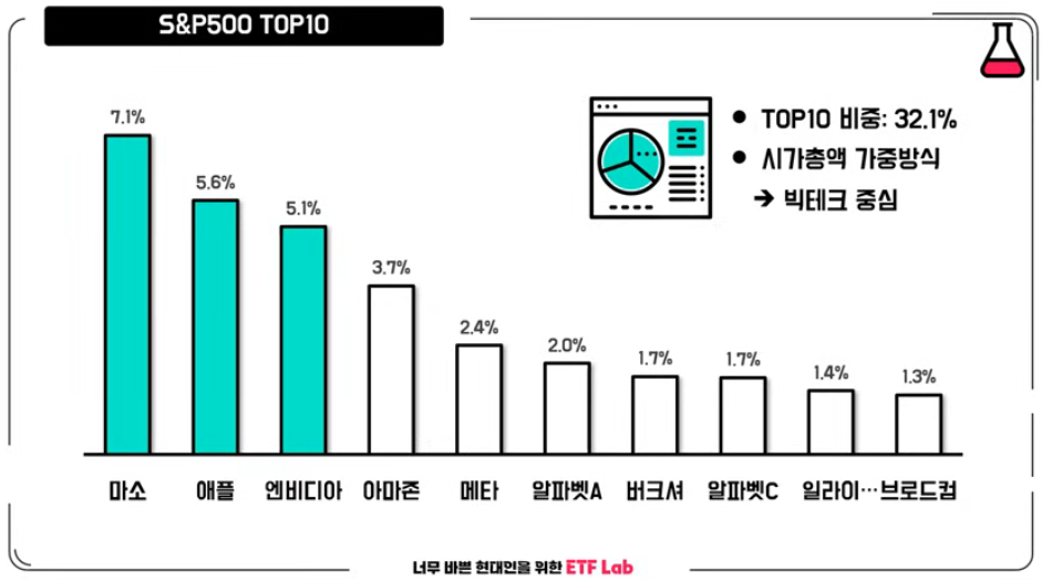 smp5 100에서 투자 비중이 높은 개 기업을 살펴보겠습니다. 투자 비중이 높다는 것은 그만큼 시가 총액이 상대적으로 높다는 건데요. 1위는 마이크로소프트 7.1%이고, 2위는 애플 5.6%, 3위는 엔비디아 5.1%입니다. 10개 기업의 비중을 보면 32.1%입니다. 그래서 탑 10 기업들은 잘 알아둬야 합니다. 하지만 S&P 500에 투자하면, 시총 변화에 맞게 고르게 분산 투자하기 때문에 문제가 없습니다.