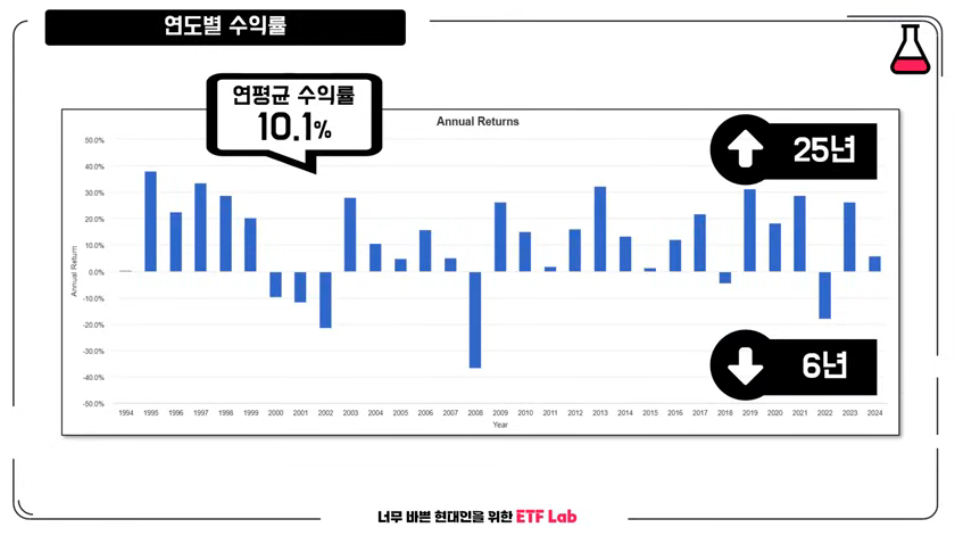 1994년부터 현재까지 연도별 수익률을 보겠습니다: 총 31년 중에 플러스 수익률을 보인 해는 25년, 마이너스를 보인해는 6년입니다. 장기적인 관점에서 10년 넘게 투자한다면 마이너스가 없이 투자할 수 있습니다. 연평균 10.1% 안정적인 모습을 보이고 있습니다. 복리 효과를 생각하면 더 큰 수익률을 기대할 수 있게 됩니다.
