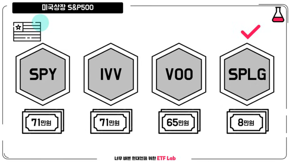 미국에 상장된 SMP 500을 살펴보면요네 가지가 있습니다. SPY, IVV, VOO, SPLG 입니다. 지수를 추종하기 때문에 수익률이 거의 동일합니다. 우리가 중요하게 봐야 할 것은 자산 규모와 총 비용입니다. 자산 규모는 가장 적은 SPLG가 48조 원입니다. 그래서 자산 규모는 걱정할 필요 없습니다. 총 비용 측면으로 보면, SPLG가 0.02%입니다. 참고로 SPY, SPLG 가 같은 회사입니다. 그런데 총 비용이 저렴한 SPLG에 투자하는 것이 좋아 보입니다.