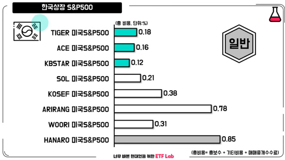 총 비용은 어떻게 구성되어 있는지 하나씩 자세히 살펴볼게요. 일반 상품의 총비용을 보겠습니다. 총비용은 운용사에서 이야기하는 총 보수, 에서 기타 비용과 매매 중계 수수료를 더한 값으로 우리가 지불하는 최종 비용입니다. 여덟 개의 종목 중에, 세 개 종목이 0.2% 이하로 구성되어 있습니다. TIGER ACE KBSTAR 종목이에요. 특히 HANARO 미국 S&P500은 0.85% 입니다.