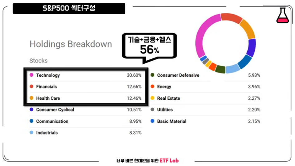 섹터 구성을 살펴보면요. 11개 섹터 중에 가장 큰 비중을 차지하는 것은 기술. 금융, 헬스케어 있니다. 세 개 섹터를 합하면 56%, 절반이 넘으며. 기술 섹터가 30% 높은 비중을 차지하고 있습니다. 그만큼 빅테크 기업의 비중이 높다는 말이 되겠죠.