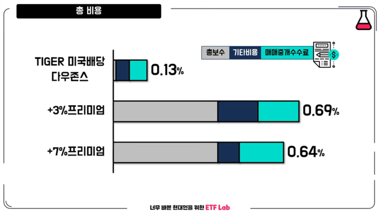 첫 번째는 총 비용입니다. 비용은 크게 세 가지가 있는데요, 총 보수, 비용 매매 중개 수수료입니다. 운용사에서 총보수에 대해 이야기하는데요, 직접 투자하는 우리는 그 밖에 다른 비용까지 체크해야 합니다. 그래서 총비용을 합하면 타이거 미국 배당 다우존스는 0.13%입니다. 프리미엄 상품들은 상대적으로 더 높은 비용이 발생되는데요, +3% 프리미엄의 총비용은 0.69%이고, +7% 프리미엄은 0.64%입니다. 프리미엄이 높을수록 비용이 더 들어가는 것은 아니네요. 자산 규모로 보면 +7% 프리미엄이 더 높기 때문에 총비용이 더 낮은 것으로 보입니다. 결과적으로 프리미엄 상품은 배당률이 올라가지만, 반대로 총비용이 0.5% 정도 더 높게 나온다는 점을 알고 계셔야 합니다.