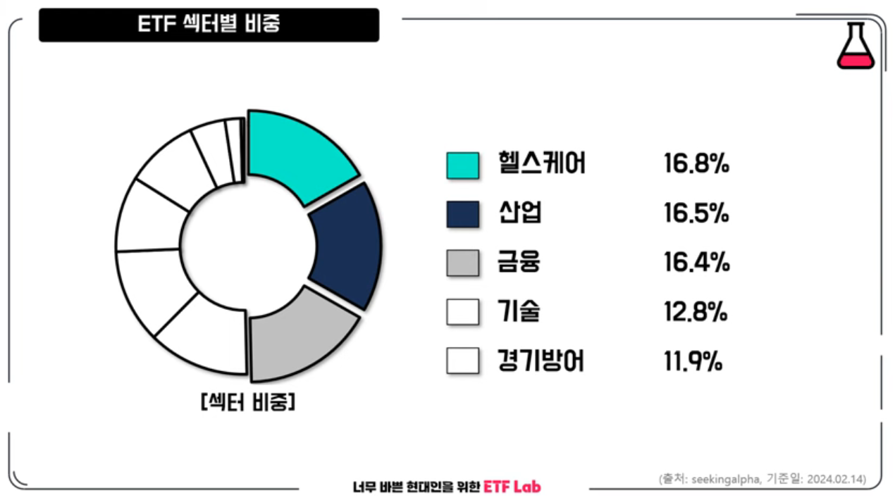 조금 더 자세히 섹터 구성을 살펴볼게요. 헬스케어 산업과 금융 섹터의 비중이 16%로 높습니다. 상대적으로 기술 섹터의 비중은 12.8%로 낮은 편인데요. 작년에 주가가 상승하지 못한 이유도 여기에 있습니다. 빅테크 기업이 없기 때문이죠. 그래서 SCHD 투자할 때 자산 배분 차원에서 성장주를 별도로 투자하는 것도 좋은 방법입니다.