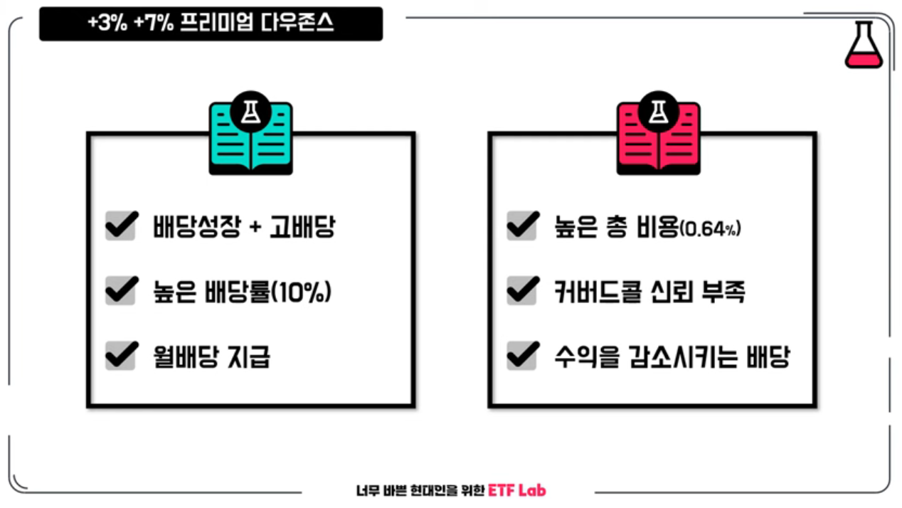 미국 배당 다우존스 커버드콜 상품의 장점과 단점을 정리해 볼게요. 우선 장점은 배당 성장과 고배당을 동시에 투자할 수 있고, 높은 월 배당금을 받을 수 있는 구조입니다. 걱정되는 부분을 말씀드려 보면요, 총비용이 다소 높고, 주가 상승에 대한 한계가 존재합니다. 최근에 커버드콜 상품이 많이 출시되고 있는데요, 검증된 전략이라고 보기엔 아직 부족한 부분이 많죠. 상승장이 아닌 하락장에서 어떻게 움직이는지 체크해 봐야 합니다. 장단점이 명확한 종목이죠.