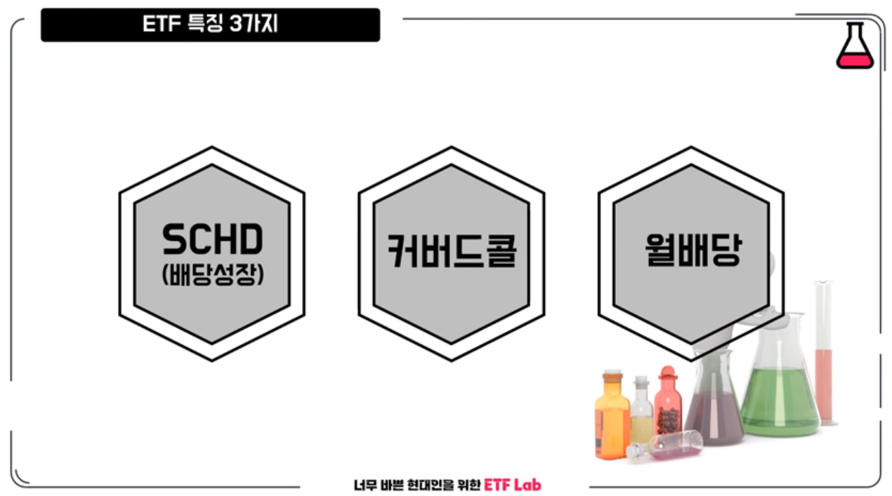 ETF특징부터 집어보면 크게 세 가지가 있습니다. 첫 번째는 배당 성장의 대표 ETF인 SCHD를 그대로 가져왔다는 것이고, 두 번째는 커버드 콜 전략으로 높은 배당금을 지급하는 구조를 갖고 있습니다. 마지막 세 번째는 요즘 대세인 달 배당을 지급하는 월배당 ETF입니다.