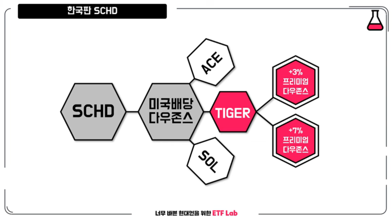 국내 상장된 SCHD는 미국 배당 다우존스입니다. 세계 운용사에서 출시했는데요, TIGER, ACE, SOL입니다. 그 중에 TIGER가 커버드콜 상품을 두 개 더 출시했죠, 3%와 7% 상품입니다. 이 상품들이 어떤 의미를 갖고 있는지 바로 뒤에서 살펴볼게요.