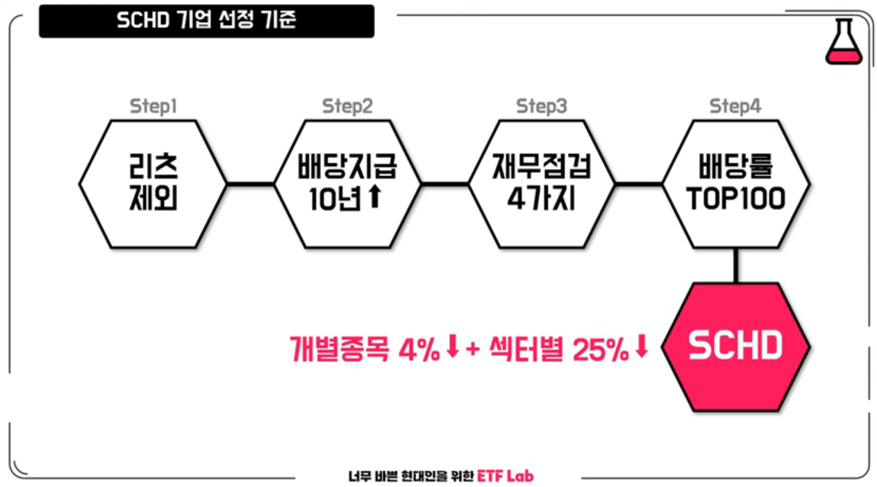 우선 첫 번째 단계로 리치 기업을 제외합니다. 최근 미국 부동산 이슈가 있는데 다행이네요. 두 번째 단계는 10년 이상 배당금을 지급한 기업을 추려내고, 5년 이상 배당금을 인상한 기업을 선별합니다. 세 번째 단계는 재무적인 안정성 검사로 다양한 항목으로 나눠 점수를 측정합니다. 마지막 네 번째는 당회에서 측정한 점수 기준으로 높은 점수 순으로 100개 기업을 추려냅니다. 최종적으로 이렇게 뽑힌 100개 기업에 투자합니다. 투자할 때는 종목당 비중이 4%를 넘지 않게 하고, 섹터별로 25-35% 이내로 포트폴리오를 구성합니다. etf 투자 기업 탑 10을 보면 브로드컴, 에비, 머크, 홈디포, 암젠, 버라이즌, 쉐브론, txn, 시스코 시스템, 코카콜라입니다. 투자 비중이 4%를 넘는 기업은 상대적으로 주가가 많이 올라서 높게 평가받고 있는데요. 브로드컴이 가장 크게 오른 것을 알 수 있죠. SCHD 자산 규모는 543억 달러이고 총보수는 0.06%입니다.
