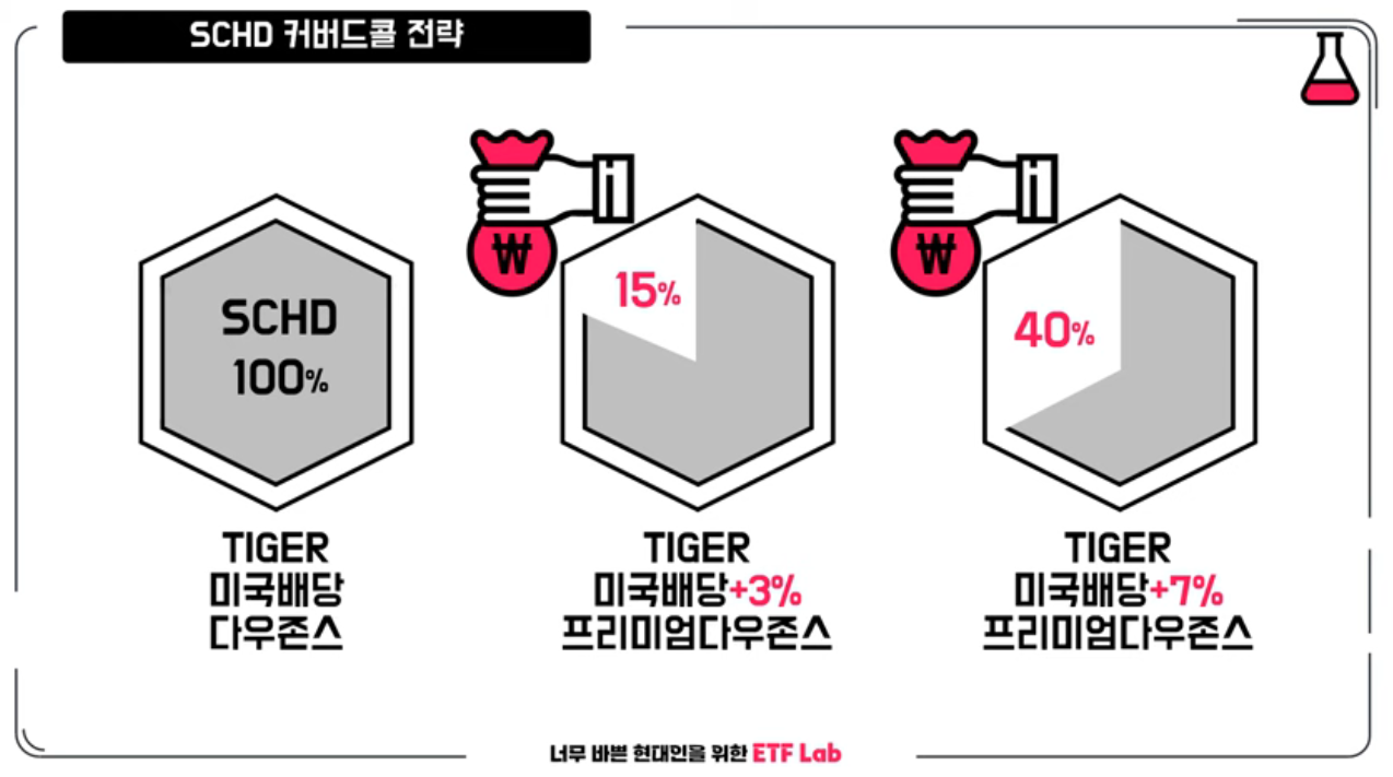SCHD 지수를 그대로 가져오면 타이거 미국 배당 다우존스가 됩니다. 커버드콜은 그중에 15%~40% 정도를 배당금의 재원으로 활용하면서 추가로 배당금을 더 받을 수 있게 하는 구조입니다. 단, SCHD 주가가 오르면 비중이 줄기 때문에 상대적으로 주가 상승률이 낮아집니다.