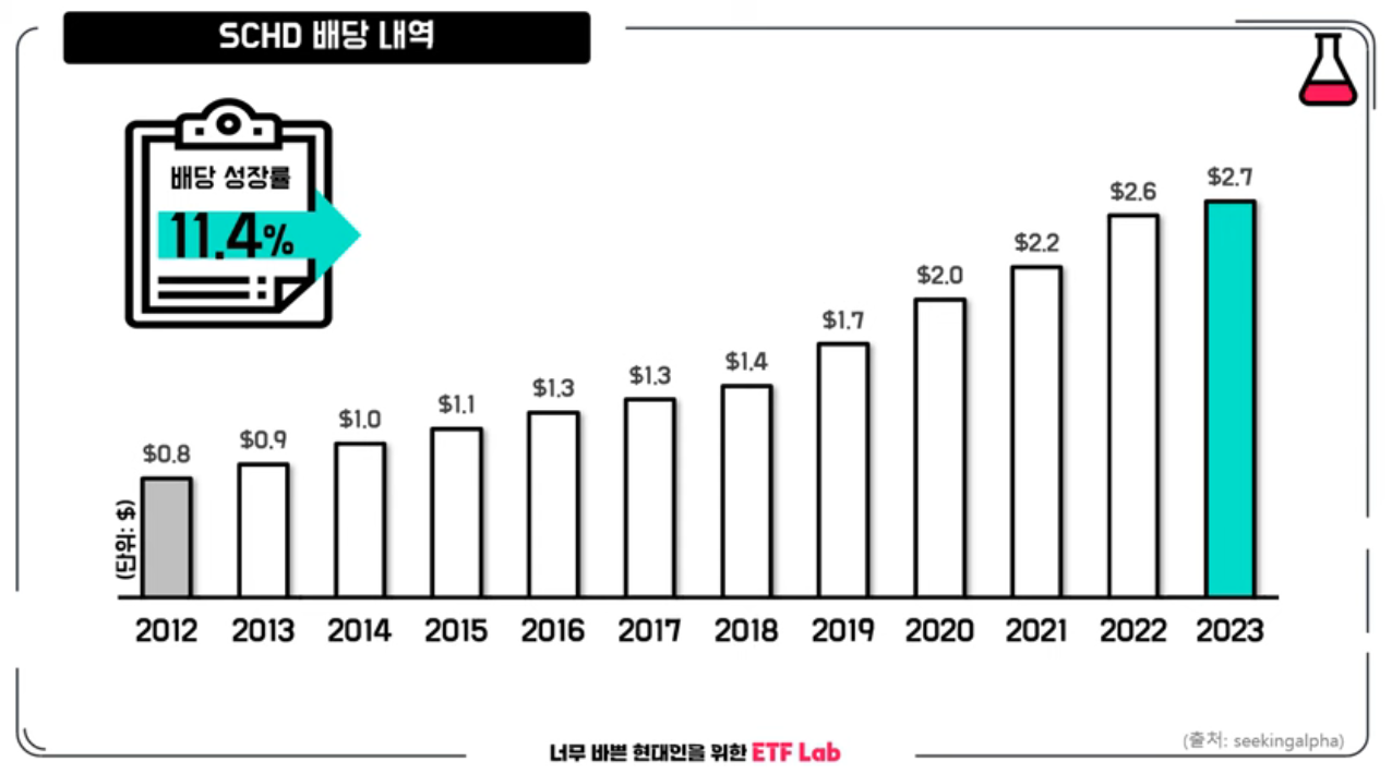 SCHD 배당 내역을 살펴볼게요. 본격적으로 배당금을 지급한 2012년부터 보면 꾸준히 우상향을 그려왔습니다. 한 해도 배당이 감소한 적이 없죠. 2012년 한 주당 배당금이 0.8 달러였는데, 2023년 말 기준으로 2.7달러가 됐습니다. 배당금이 세배 이상 증가한 거죠. 쉽게 이야기하면 2012년에 배당금 100만 원을 받았다면 2023년에는 337만 원을 받게 되는 겁니다. 투자금을 늘리지 않아도 배당금 인상만으로 이렇게 증가합니다. 이런 이유로 배당 성장 ETF인 SCHD가 사랑받는 겁니다.