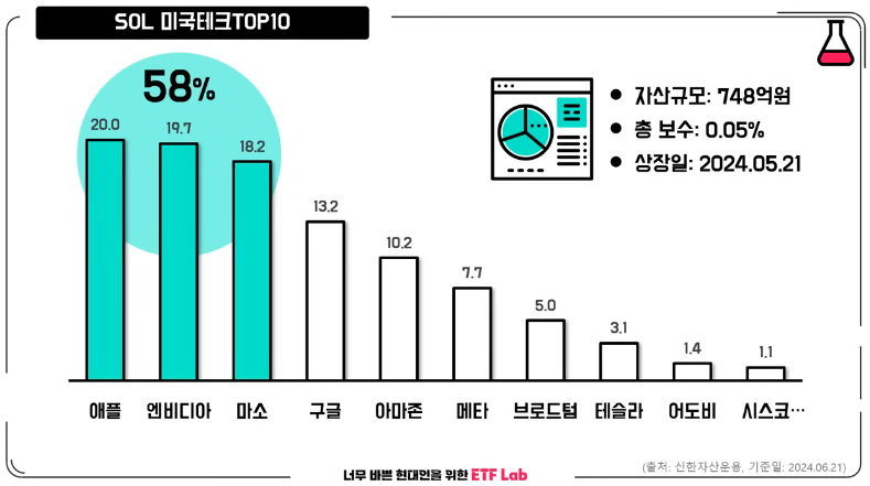 마지막으로 SOL 미국 테크 TOP 10입니다. 종목 비중을 보면 처음에 소개한 TIGER와 동일한 투자 분포를 보이고 있습니다. 애플, 엔비디아, 마이크로소프트가 전체 투자금의 58%를 차지하고 있으며, 프로도 마찬가지입니다. 상장일은 2024년 5월 21일로 한 달 밖에 되지 않은 신규 주식입니다. 따라서 자산 규모도 748억 원으로 작습니다. 하지만 총 보수가 0.05% 더 저렴합니다.
