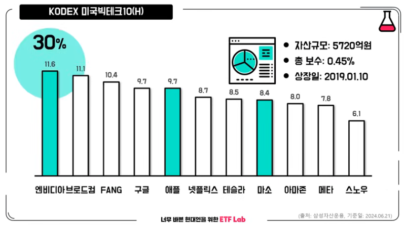 KODEX 미국 빅테크 10입니다. 종목명 끝에 "H"가 붙는 것은 환헤지를 사용했음을 나타냅니다. 현재 달러가 너무 비싸서 환율 변동에 노출되는 상품을 원하지 않는다면 코덱스 상품을 선택할 수 있습니다. 투자 기업의 비중을 보면 코덱스는 앞서 설명한 TIGER ETF와는 다른 구조를 가지고 있습니다. 코덱스는 모든 종목에 동일한 10% 가중치로 투자하는 방식을 채택하고 있습니다. 주가 변동에 따라 현재 비중은 조금씩 달라집니다. 시가총액 가중치가 아닌 동일한 비율로 투자하고 싶으신 분들은 코덱스 주식을 고려해 볼 수 있습니다.