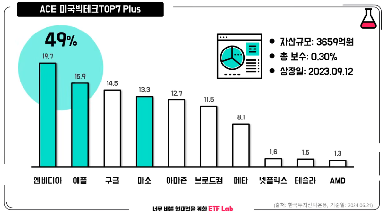 세 번째 종목은 ACE 미국 빅테크 TOP7 Plus입니다. 투자 기업을 살펴보면 상위 7개 기업의 비중은 높지만 나머지 3개 기업의 비중은 현저히 낮습니다. TOP 7에 초점을 맞춘 상품답게 7개 기업에 집중적으로 투자하는 상품입니다. 선정된 7개 기업은 엔비디아, 애플, 구글, Microsoft, 아마존, 브로드컴, 메타입니다. 안타깝게도 넷플릭스, 테슬라, AMD의 비중은 1%로 매우 적습니다.
