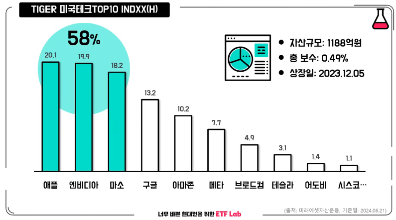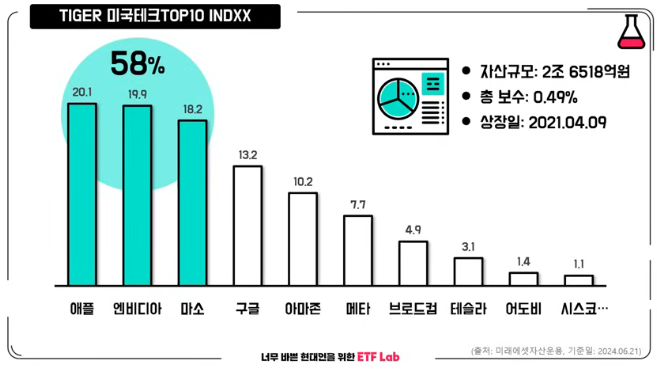 첫 번째는 Tiger 미국테크 TOP 10입니다. 자산 규모를 보면 2조 6519 원으로 가장 큽니다. 투자 기업 비중을 살펴보면 애플, 엔비디아, 마이크로소프트가 각각 20% 내외로 가장 높은 비중을 차지하고 있습니다. 시가총액이 가장 높은 이 세 회사의 비중을 합치면 58%로 절반이 넘습니다. 안타깝게도 테슬라의 비중은 3.1%에 불과해 시가총액이 크게 감소한 것으로 나타났습니다. 나스닥에서 10개 종목만 골라서 비례 투자하고 싶다면 이 종목들을 선택하면 됩니다.