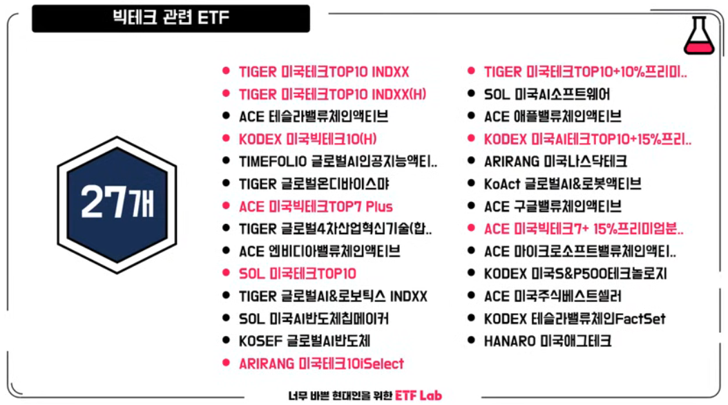 현재 큰 인기를 끌고 있는 빅테크 ETF에 대해 알아보겠습니다. 연금저축, ISA, IRP를 통해서도 투자할 수 있다는 점을 알아두면 유용합니다. 국내에는 총 869개의 ETF가 상장되어 있으며, 이 중 258개는 국내가 아닌 해외에 투자하는 ETF입니다. 이 중에서 세 가지 필터링 방법을 통해 27개의 ETF를 선정했습니다.