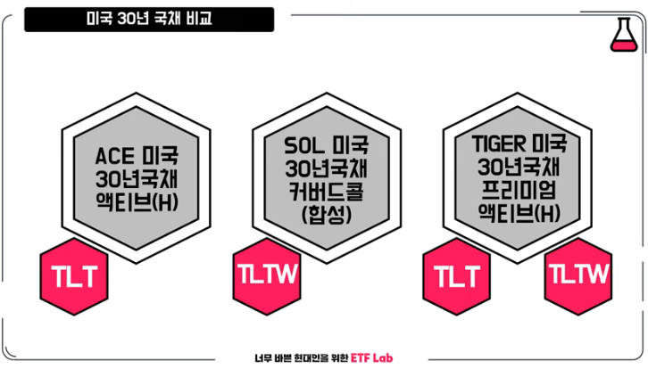미국 30년 국채 장기 채권 ETF로 대표적인 다른 두 종목은 에이스 미국 30년 국채 액티브, 솔 미국 30년 국채 커버드 콜입니다. 우선 에이스 미국 30년 국채 액티브는 tlt와 동일하다고 보면 됩니다. 미국 장기 채권 그대로 가지고 온 상품이죠. 가운데 솔 미국 30년 국채 커버드 콜은 고배당 상품으로 tlt와 동일하다고 생각하시면 됩니다.