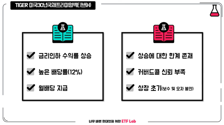 타이거 미국 30년 국채 프리미엄 액티브의 장점과 단점을 정리해 볼게요. 우선 장점은 앞에서 소개한 내용들인데요. 금리 인해 따른 수익률 상승이 기대되고 높은 월 배당금을 받을 수 있습니다. 걱정되는 부분을 말씀드리면, 기준 금리가 끝없이 내려가는 건 아니기 때문에 상승에 대한 한계가 분명 존재합니다. 그리고 최근에 커버드 콜 상품이 많이 출시되고 있는데, 검증된 전략이라고 보기에 아직 부족한 부분이 많습니다.