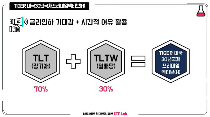 오늘 소개해 드린 타이거 미국 30년 국채 프리미엄 액티브는 TLT, TWW 혼합된 상품이에요. 7대 3으로 어떤 상황에 투자하는 게 좋은지 말씀드릴게요. 앞으로 기준 금리가 빠르게 인하될 것으로 보인다면 높은 수익률을 목적으로 에이스 미국 30년 국채 액티브에 투자하는 것이 좋습니다. 기준 금리가 인하되는 시간이 조금 더 걸려서 변동성이 심할 것 같다면 솔 미국 30년 국채 커버드 콜에 투자하는 게 유리합니다. 높은 월 배당을 받으며 금리 인하를 기다릴 수 있습니다. 마지막으로 두 마리 토끼를 모두 잡고 싶다면 타이거 미국 30년 국채에 프리미엄 액티브를 선택하면 됩니다. 기준 금리 인에 따른 수익률과 횡보했다 변동성에 따른 월 배당을 받을 수 있습니다.