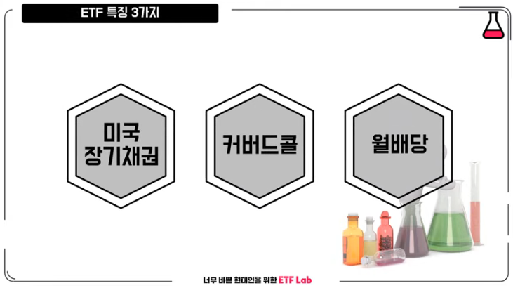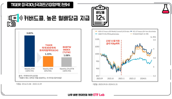 TIGER 미국 30년 국채 프리미엄 액티브 상품은 3가지 특징이 있습니다. 첫 번째는 요즘 많이 투자하는 TLT 같은 미국 장기 채권에 투자하는 상품입니다. 두 번째는 커버드 콜 전략으로 높은 배당금을 지급하는 구조를 갖고 있습니다. 마지막 세 번째는 요즘 대세죠, 매달 배당을 지급하는 월배당 형태입니다.