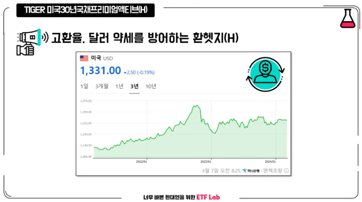 또 다른 장점이라면 화해지 상품이라는 건데요. 현재 원달러 환율이 130원 넘었습니다. 3년째 고환율을 유지하고 있는데요. 만약 환율이 1원까지 하락한다면 177%의 치명적인 손실을 보게 됩니다. 이런 불상사를 막기 위해 환해지 상품으로 출시됐습니다. 반면에 달러 자산을 보유하고 싶은 투자자는 직접 투자하거나 환율에 노출된 상품을 고려해 보는 것이 좋습니다.