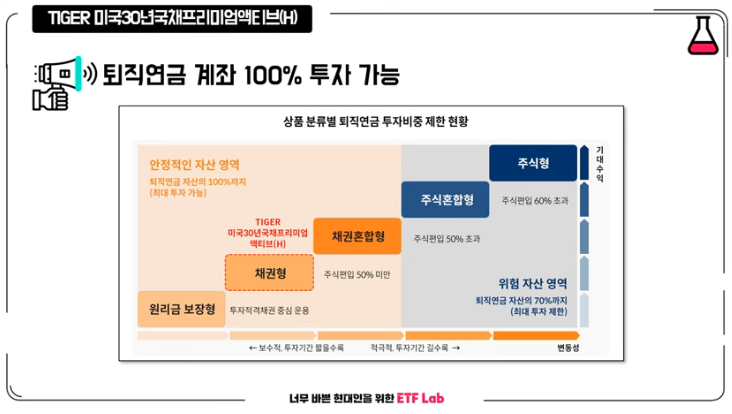 퇴직 연금으로 투자할 수 있다는 겁니다. 절세 혜택과 함께 과세 이연 효과를 누릴 수 있습니다. 채권형 ETF는 안전 자산으로 속하기 때문에 100% 투자할 수 있습니다. IRP에서 안전 자산 30% 대한 고민이 있으셨던 분들은 참고해 주세요.
